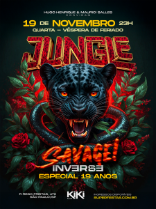 A JUNGLE SAVAGE marca a estreia da festa no KIKI KLUB, em uma ambientação criada para explorar o lado mais quente, próximo e carnal da JUNGLE: suor, contato, intensidade e liberdade em estado bruto.